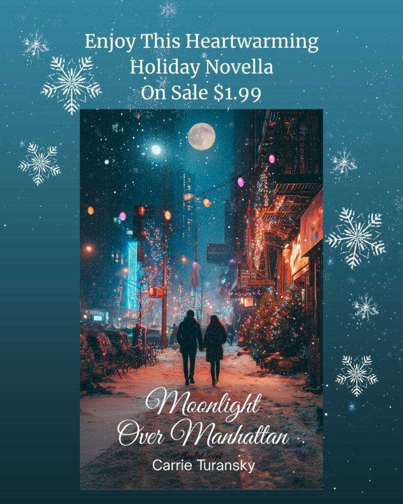 Would you like to experience Christmas in New York City? Even if you don’t live close enough to take the train in, you can get a taste of the sights and sounds by reading Moonlight Over Manhattan. This heartwarming holiday novella is on sale now through Christmas for only $1.99 at Amazon. Here’s a bit more about the story: